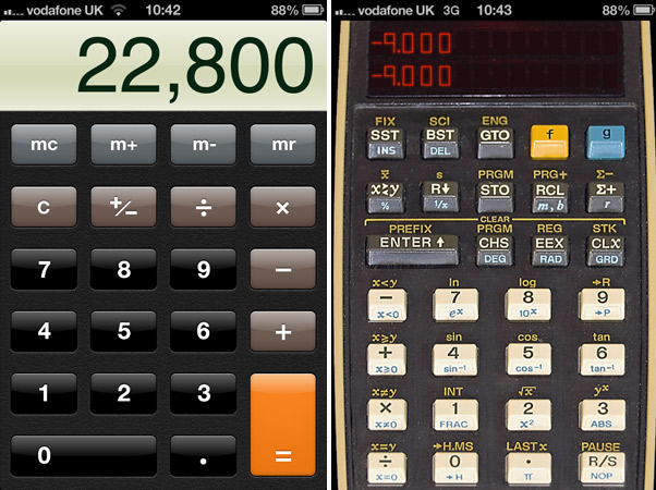 Interestingly the original iOS calculator took a lot of inspiration from a real-life calculator, the Braun ET44. Nowadays the buttons are square but the calculator app does still look based on one of many calculators which were knocking around in the 1970s and early 80s. Personally i am fine with the built-in app though i do have a RPN calculator (RPN25, below right) as an alternative, its based on the HP-25. It isn't that good but it was free and looks funkily retro. If i'm at home i prefer to use my real HP-12C...